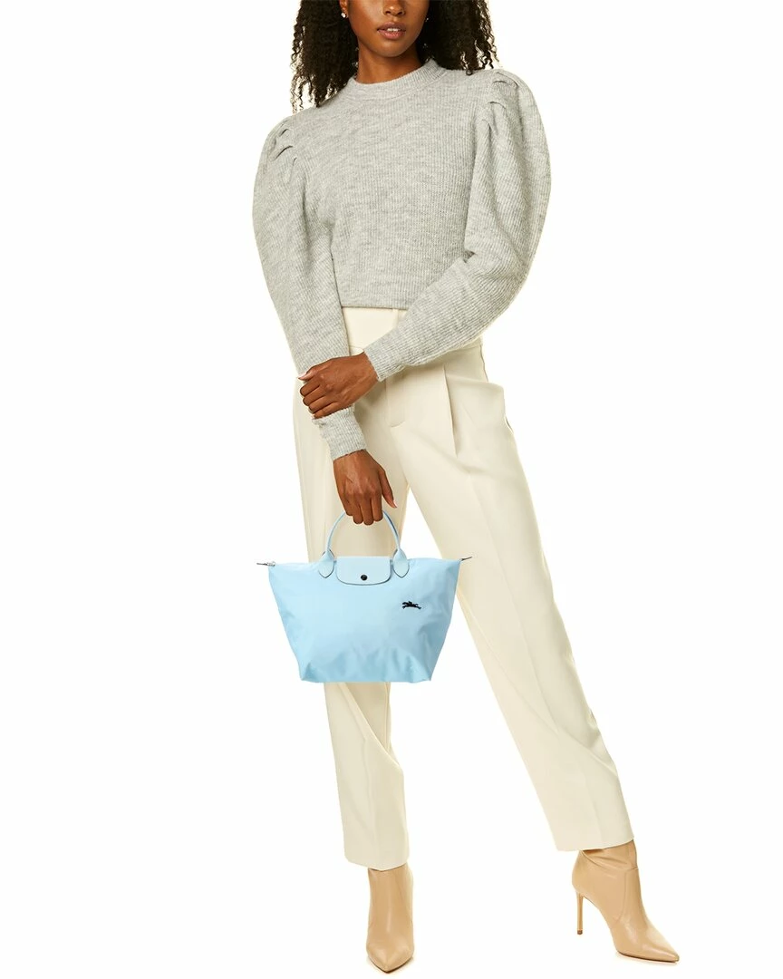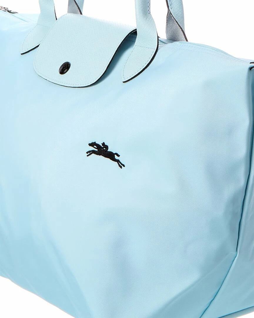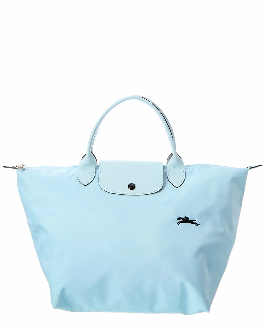 - Le Pliage Club Medium Canvas & Leather Top Handle Tote in nuage polyamide canvas with inside coating/cowhide trimming and silver-tone hardware with horse embroidery