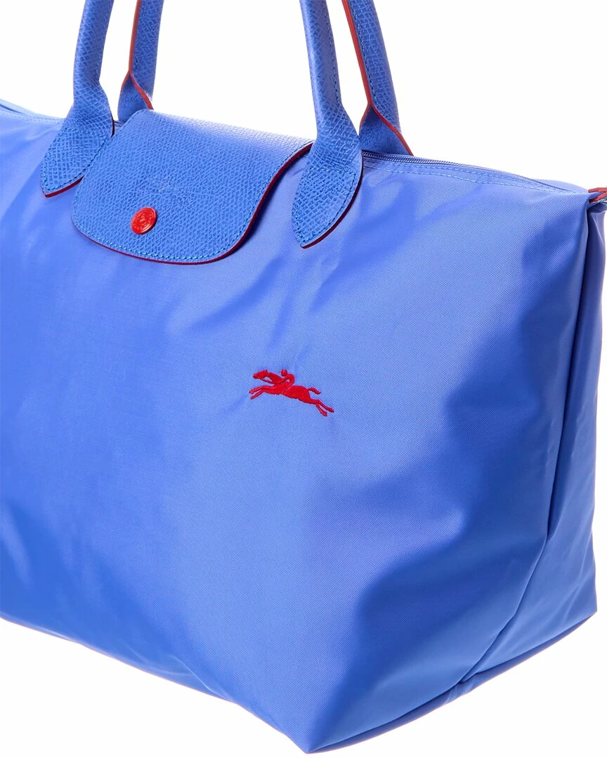 - Le Pliage Club Medium Canvas & Leather Top Handle Tote in myosotis polyamide canvas with inside coating/cowhide trimming and silver-tone hardware with horse embroidery