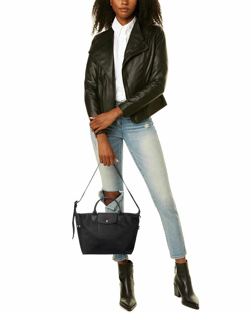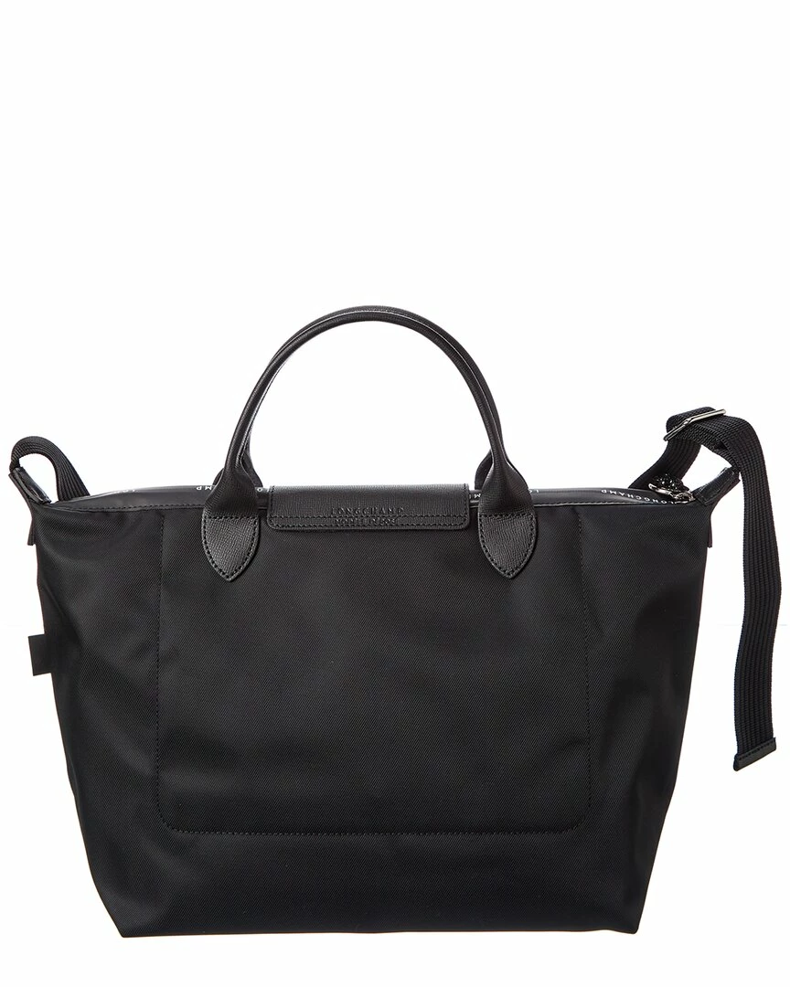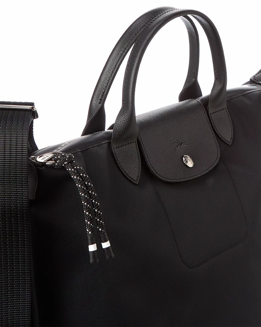 - Le Pliage Energy Nylon & Leather Short Handle Tote in black nylon and leather and silver-tone hardware with logo trim along zipper