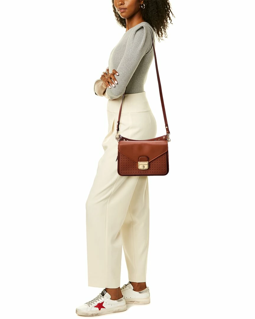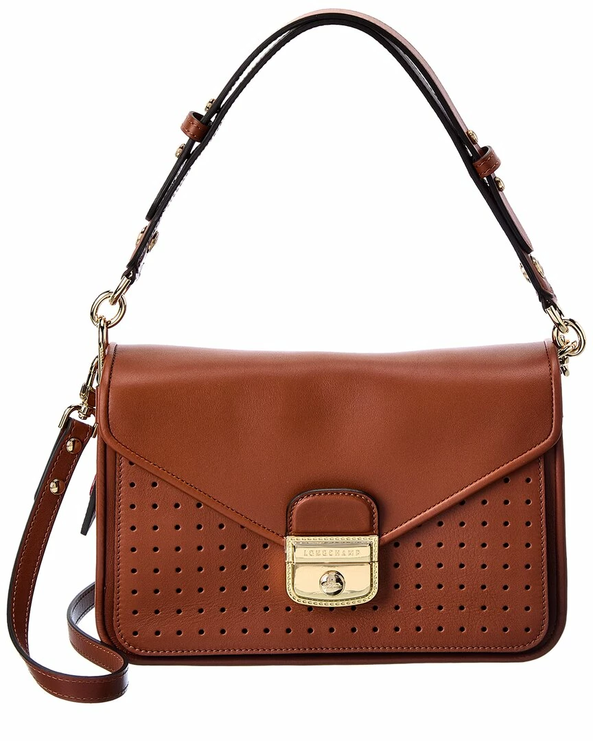 - Mademoiselle Medium Leather Shoulder Bag in cognac leather and gold-tone hardware with perforate detailing and zippered pocket