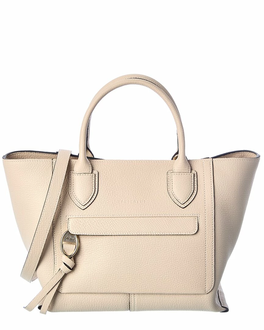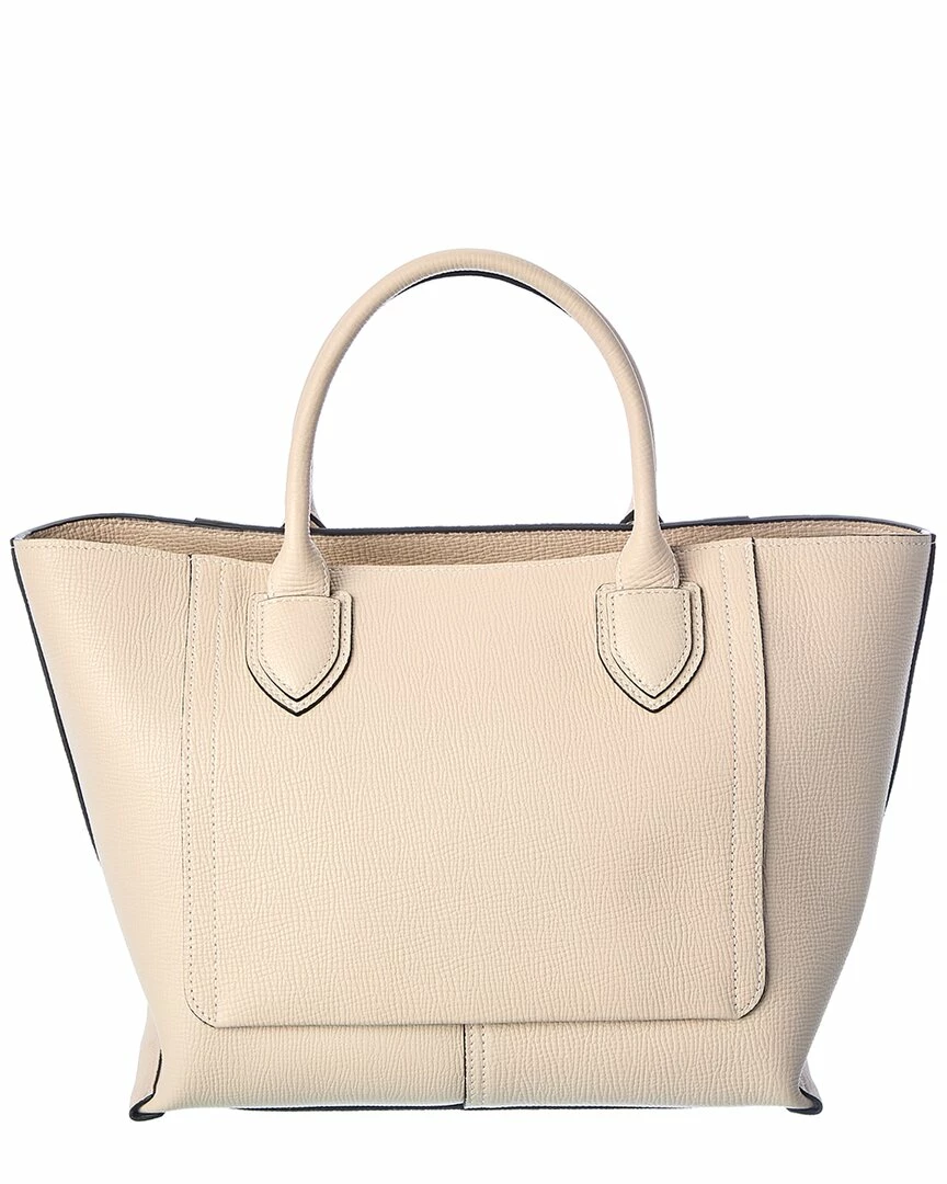 - Mailbox Medium Top Handle Leather Tote in chalk cowhide and very pale gold-tone hardware with exterior zip pocket